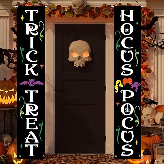- Front Porch: Make it spooky with pumpkins, skulls, and “Trick-or-Treat” signs.