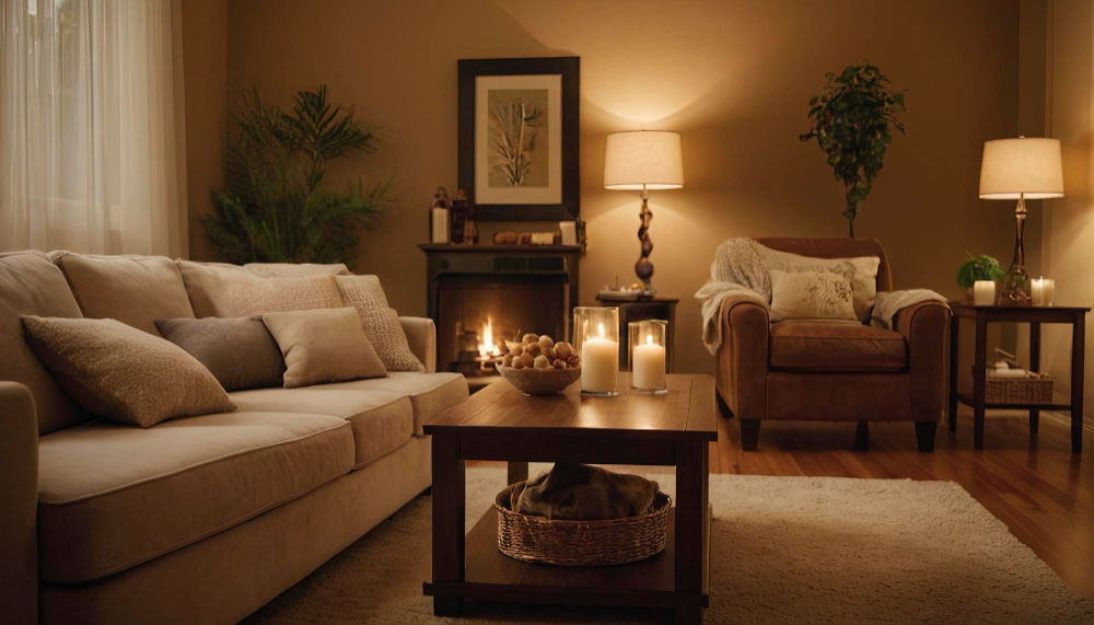Warm and soft colours help create a cosy atmosphere in the living room. Shades like beige, cream, warm grey, brown, and muted greens work well. These colours feel calming and balanced rather than harsh. Lighting should be soft and layered, using table lamps or floor lamps instead of ceiling lights. Warm light creates a comfortable glow that makes the room feel welcoming.