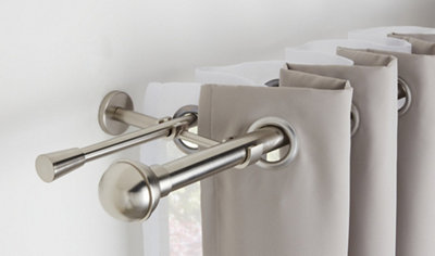 One of the most common ways of attaching curtains to the rods is through curtain rings. When using two curtains on the same pole, you need to place one curtain ring beyond the bracket on each side to hold the ends of the curtains in place. If you hang only one curtain on a pole, you can place a ring beyond the bracket on only one side.