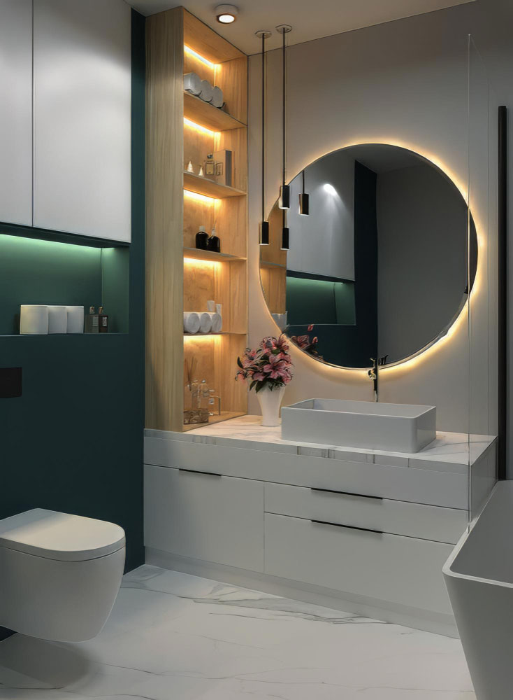 - Colour temperature should match the bathroom & desired mood