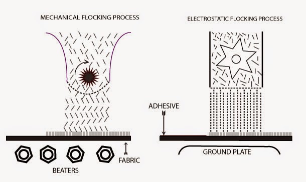 Flocking process or flocking is a printing process in which in the old days waste product of woollen cloth were used. Those used to come in the powdered form of wool. Nowadays manmade short fibres like rayon, cotton, wool or another natural or synthetic etc. material are applied on an adhesive coated surface.