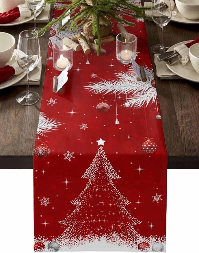 Cover your dining table with a vibrant red tablecloth to set the holiday tone. Enhance the look by layering it with green table runners, napkins, or placemats. Arrange a snow-white dinner set that beautifully contrasts with the red and green accents. Pair it with gold cutlery to infuse a luxurious and sophisticated charm into your table setting.