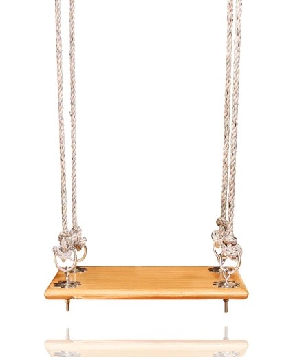 In design of the teardrop or egg swings, you can create a fabric swing and pass hanging ropes between the hemmed sides. Connect the ropes with one wooden bar and then suspend it from the ceiling.