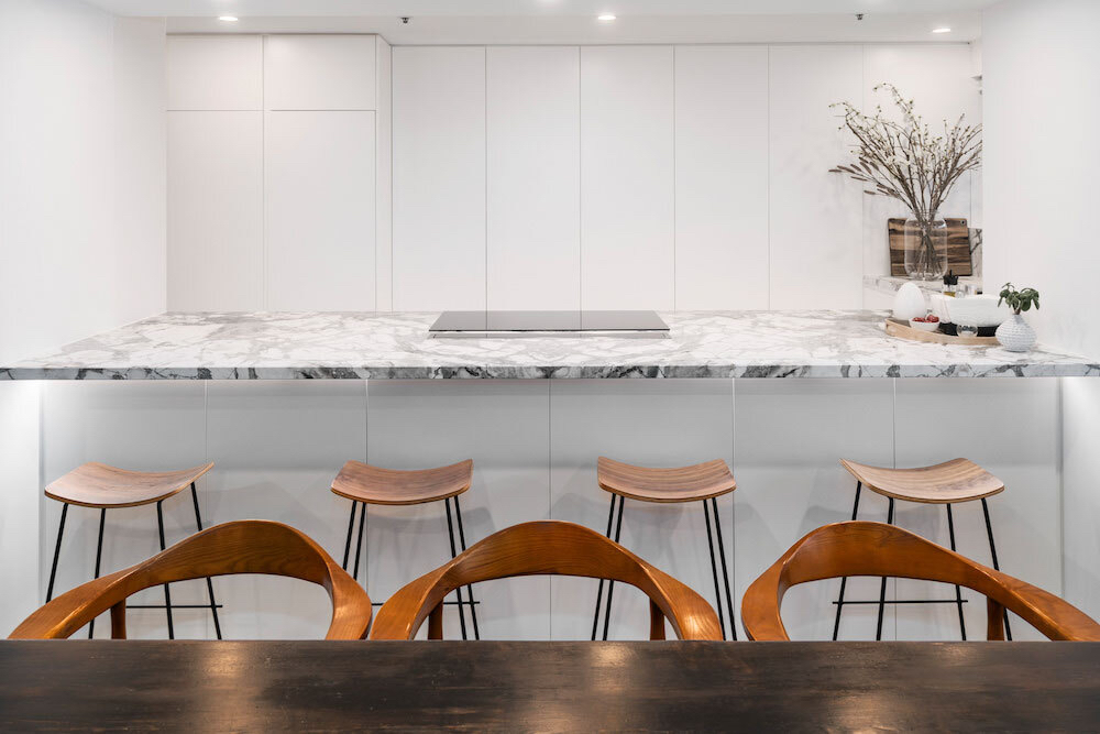 When you have a small kitchen island, like this one, it’s important to select the right and space-saving counter stools that not only match the undertones of the counter, but also allow for a seamless transition—this makes a small space feel larger and intentionally designed.