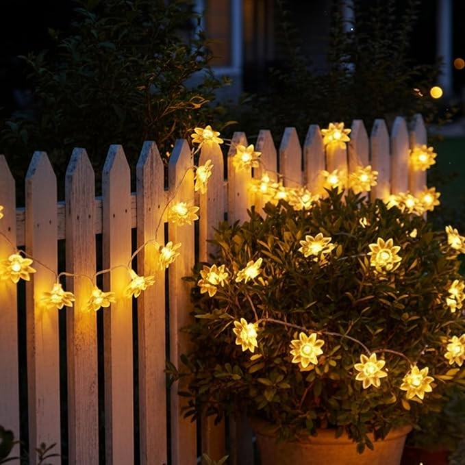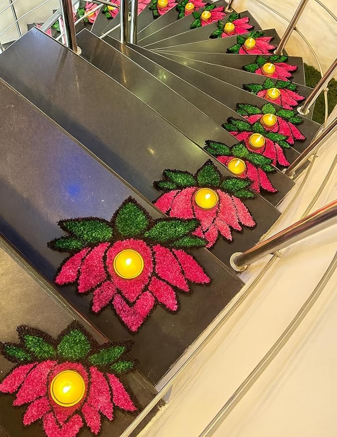 Use good-quality waterproof LED lights for exterior spaces, secure all electrical connections, and avoid overloading power sockets. Opt for LED diyas or battery-operated candles instead of open-flame oil diyas on stairs to prevent fire accidents. Keep flammable materials away from lights and ensure walkways are clear and safe.