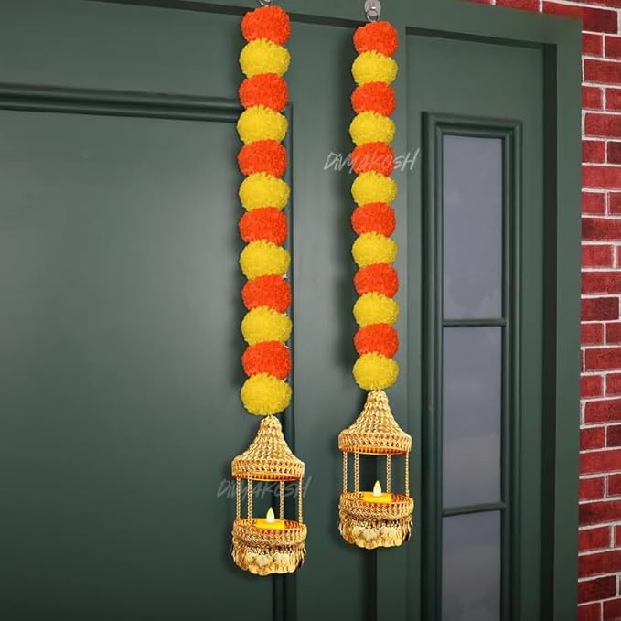 Start by making a vibrant rangoli at the doorstep and placing LED diyas along the entry stairs. Hang a mango leaf toran or marigold garland on the main door, add plantain saplings if possible, and wrap the railings with string lights or fresh flowers. This creates a warm, welcoming look that instantly sets the festive mood.