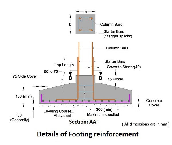 - It also stresses ensuring correct positioning, cover blocks, and column bar extensions into the footing.
