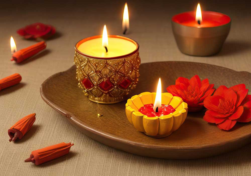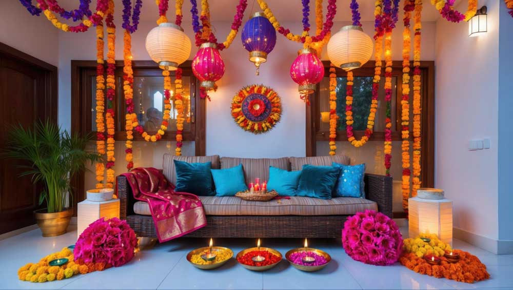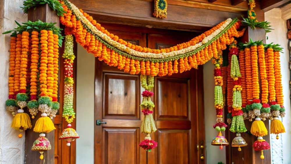 For festive home decoration, use torans made of marigolds or beads, create traditional rangolis, light diyas or candles, and decorate with gold or silver accessories.