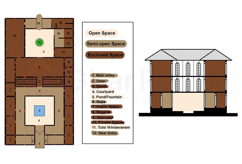 - Typical spaces include Osari (verandah), Devdi (guard space), Diwankhana (formal hall), Majghar (private hall), Devghar (prayer room), kitchen, treasury, and storage rooms.